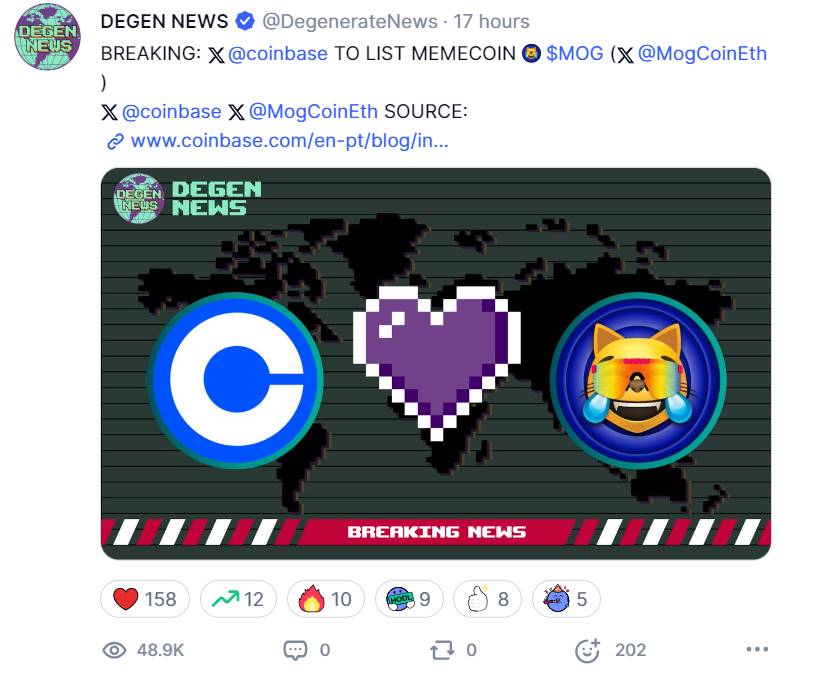 是一个笑哭的猫猫头形象代币,最初于 2023 年 7 月作为一个玩笑推出,象征“无忧和积极态度”的 Joycat 标志很好地引起了共鸣。MOG 以其幽默和社区驱动增长的关注而闻名,目前市值近 10 亿。其对病毒式内容和模因文化的重视,加上显著的交易量和近期在 Coinbase 交易所的上市,凸显了其在不断发展的加密货币领域中获得显著回报的潜力,已在各大主流交易所上线。
