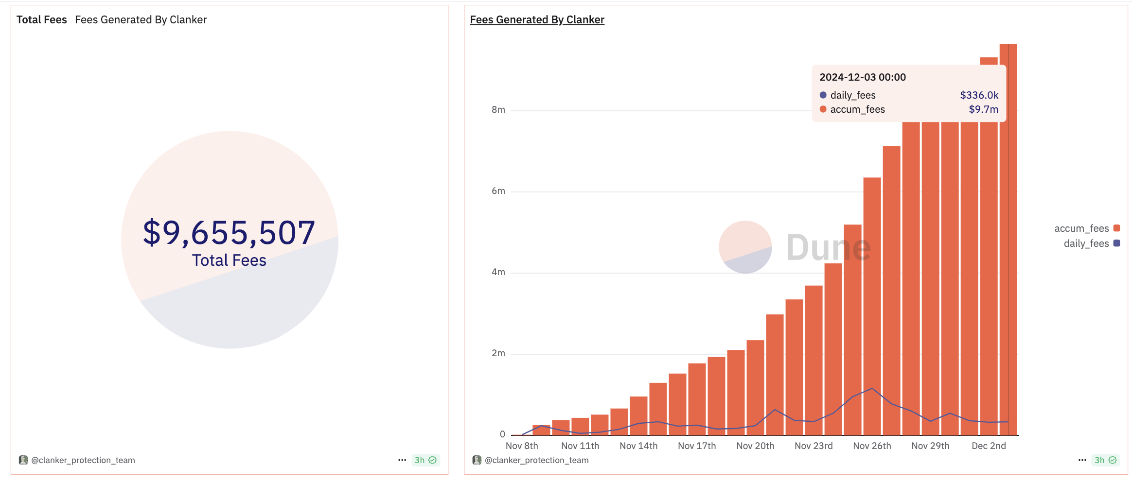 Clanker 是基于 Farcaster 的一款 AI 发币平台,简单理解为 farcaster 版本的 pump.fun。通过 Clanker 让代币资产的发行变得更加容易。是由 Farcaster 的全栈工程师 Jack Dishman 和 Farcaster 生态系统研发 founder @proxystudio.eth 开发的。截止 2024 年 12 月 3 日,Clanker 共产生了 965 万美元的收入。Clanker 发行的第一个 meme 就是 CLANKER。CLANKER 市值最高一度达到 1.43 亿美元,目前回落到 4300 万美元。