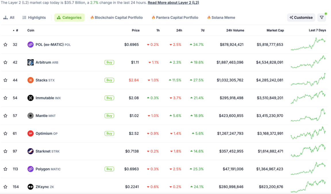 值得注意的是,Stacks 代币 STX 是比特币 Layer 2 (智能合约层)代币,涨势不弱于以太坊 Layer 2 。