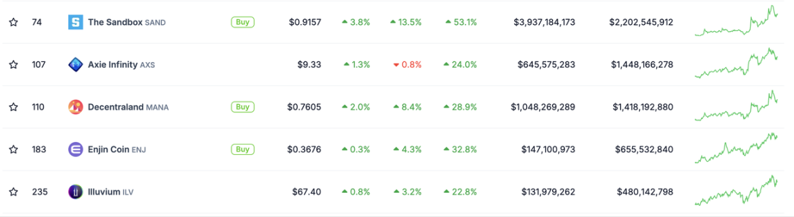「元宇宙」概念也在上周回暖,SAND、AXS、MANA 等头部项目涨势喜人。