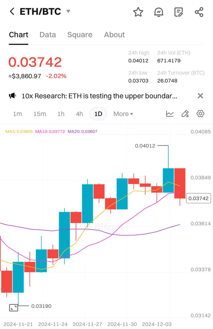 年初以来走势不佳的 ETH 在上周强势补涨。进入本周后继续补涨, 12 月 5 日,以太坊价格一度突破 3900 美元,ETH 兑 BTC 汇率周内一度回升超 10% 。