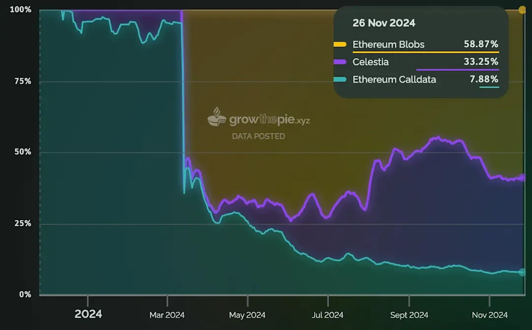 目前,约 35% 的L2/L3数据发布到替代 DA 层(下图不包括 Avail、NearDA 和 EigenDA),其余数据发布到以太坊(主要以 blob 形式)。相关指标和数据面板可在 Celestia、以太坊和 GrowThePie 上查看。