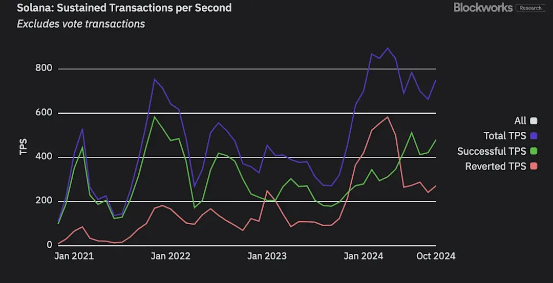 Solana 近几个月的平均交易处理能力维持在每秒 700-800 笔(数据来源:Blockworks Research)