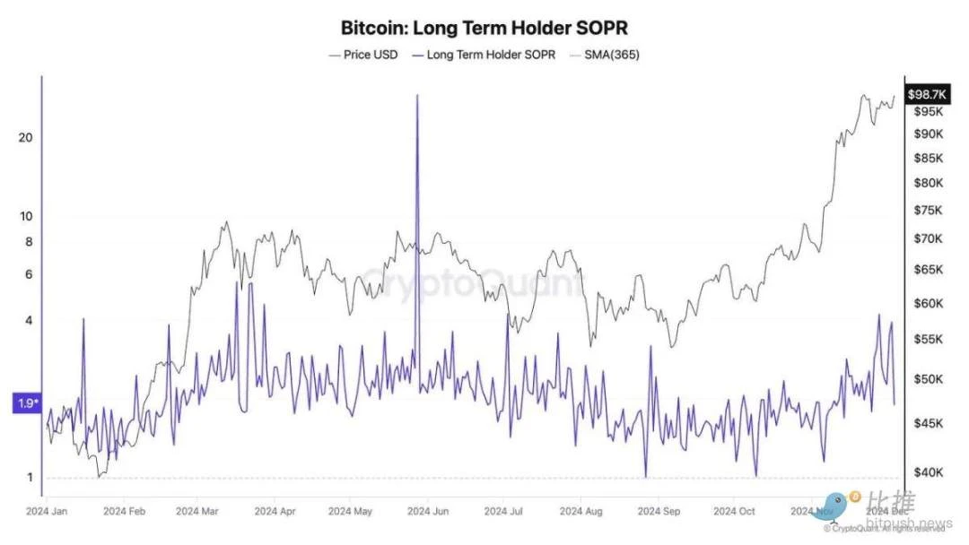 CryptoQuant 的数据显示,比特币在突破 10 万美元大关后,长期持有者(LTH)开始获利了结。「长期持有者花费产出利润」比率 (LTH-SOPR) 指标显示,长期持有者出售的比特币已实现其原始购买价格四倍的利润。CryptoQuant 研究主管 Julio Moreno 指出:「在 BTC 突破 10 万美元大关后,长期比特币持有者 (LTH) 开始获利,这是比特币牛市期间的正常现象,获利了结仍远未达到极端水平。」