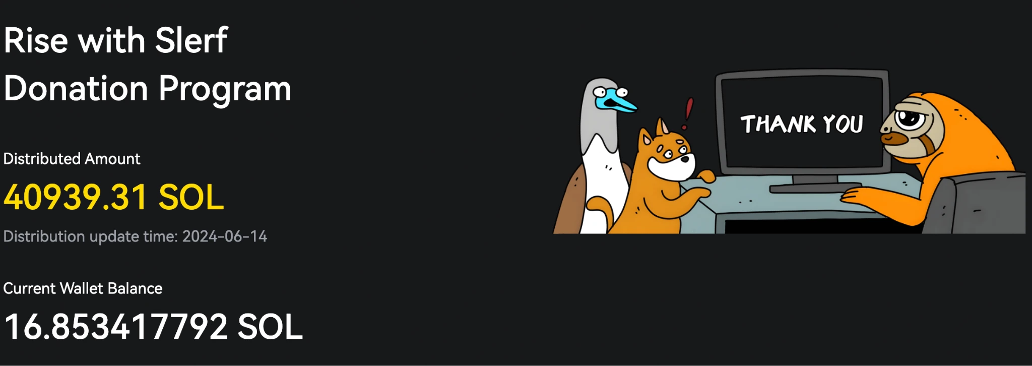 期间,SLERF 创始人与 LBank 合作发起了捐款活动,LBank 不仅作为首位捐款人,还担任了捐款地址的托管人。截止 6 月 14 日,链上捐款地址收到超过 4 万 SOL,已用于对参与 SLERF 私募用户的补偿。