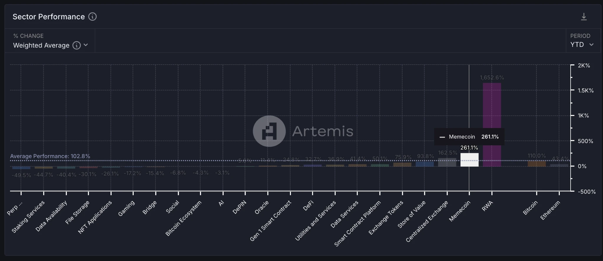 根据 Artemis Terminal 数据,截止 11 月 27 日,Meme 币在 2024 年初至今的加密赛道中表现卓越,以 261% 位居第二,成为仅次 RWA 的最佳叙事。