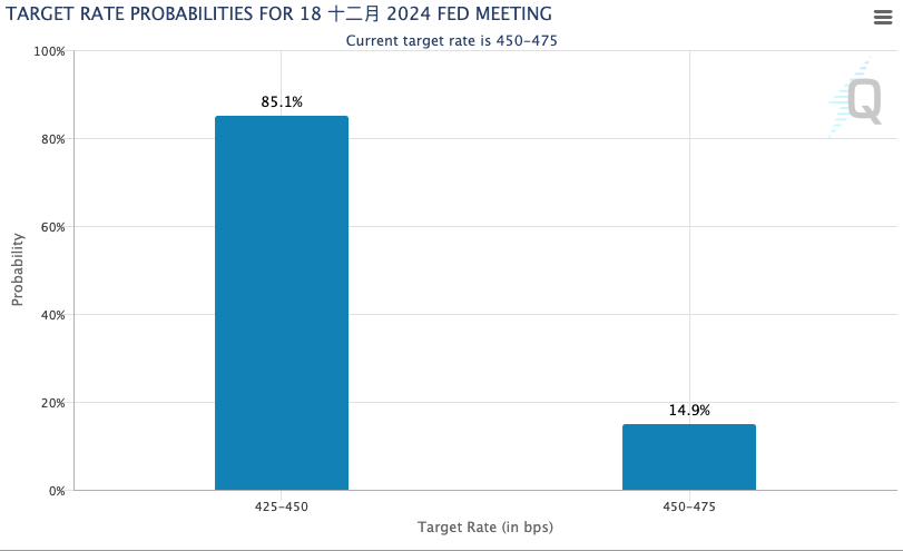 另据芝商所 Fed Watch 工具 显示,目前市场预期本月降息 1 码的机率已经攀升至 85.1%,相较于昨日中午市场预期的 71.8%,上升了整整 13.3%;不降息机率则是降至 14.9%。