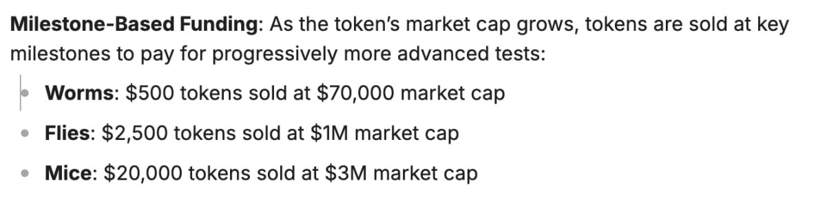 当该方案在真实线虫上进行测试时,就可以观看实验数据流。数据定期传输给用户,供用户评估干预措施的价值。当然,更进一步,之后还会对果蝇、小鼠身上进行测试,收集更昂贵、更耗时但更与人类相关的数据。相关干预措施在获得许可后,可以作为补充剂或研究化学品出售。当然,随着代币市值的增长,代币会在关键里程碑处(7 万美元市值、 100 万美元市值和 300 万美元市值时)出售,以支付逐步更高级的测试费用。