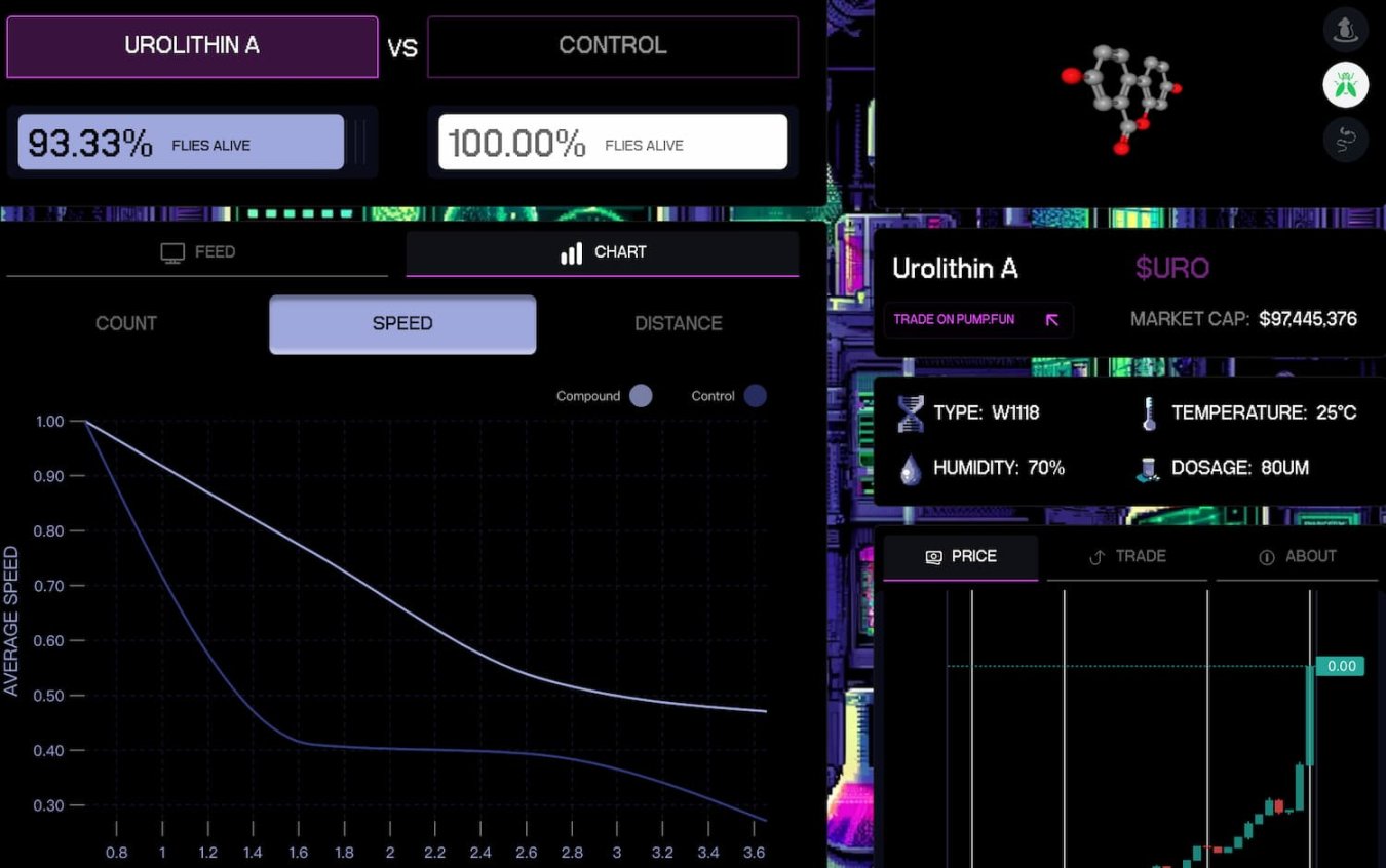 当前在 pump.science 上仅有两项实验,利福平 Rifampicin(RIF)和尿石素 A Urolithin A(URO),且均处于果蝇测试阶段,市值分别为 1.9 亿美元和 9700 万美元。两项实验的完成进度均为 2.74% 。