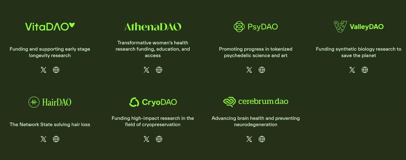 VitaDAO(代币 VITA, 1.3 亿美元市值):详见《 DeSci 淘金|龙头 VitaDAO:如何引领长寿研究? 》。