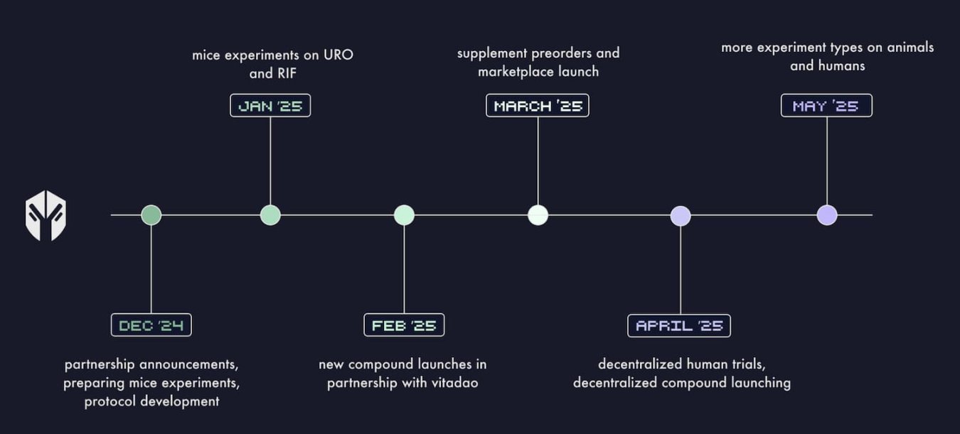 根据 pump.science 路线图, 2025 年 1 月 25 日,将利用利福平 Rifampicin(RIF)和尿石素 A Urolithin A(URO)进行小鼠试验, 2025 年 2 月 25 日与 VitaDAO 合作启动新的化合物, 3 月 25 日开放补充剂预定和启动市场, 4 月将进行人体试验。
