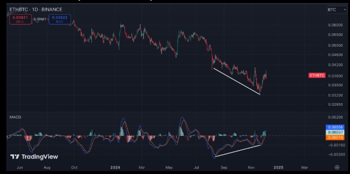 该图表显示出看跌背离(白缐),这表明以太币在未来几个月的表现将超过比特币。