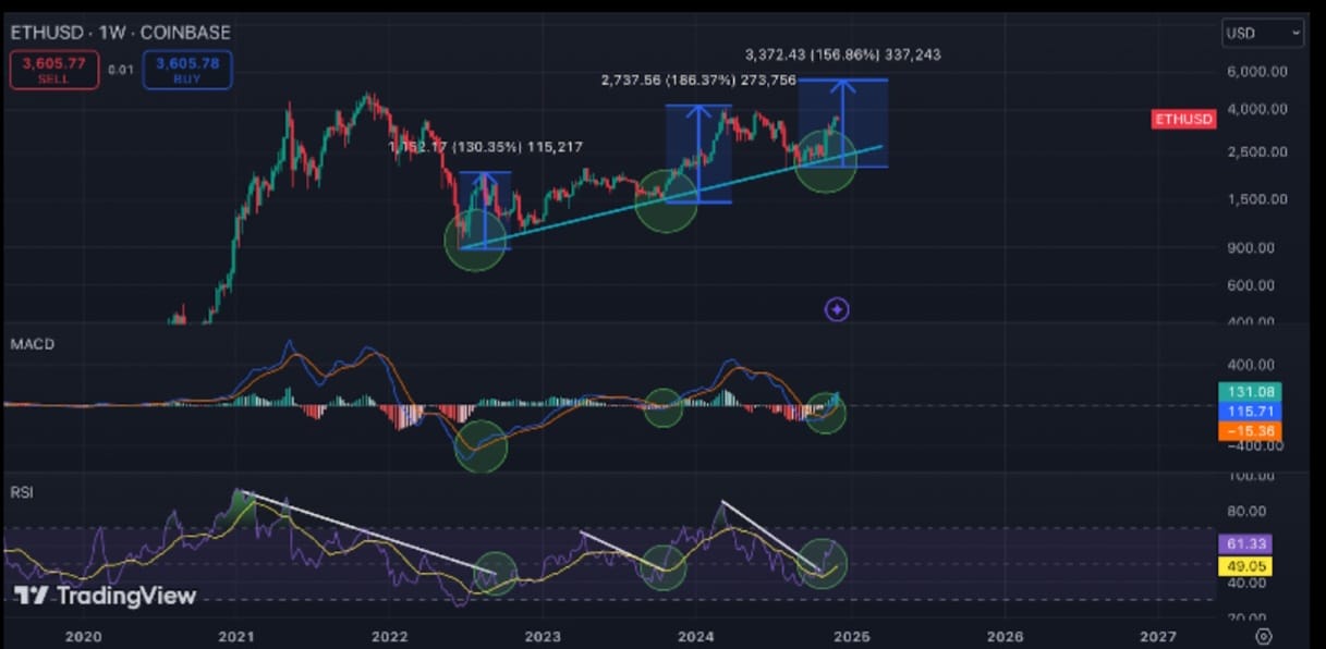 目前,以太币似乎只完成了这一趋势的一半。如果这些历史模式保持不变,以太币可能会在 2025 年第一季度达到 5,000 美元至 6,200 美元,平均目标为 5,600 美元。