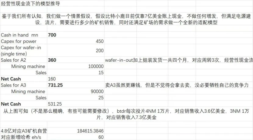 关于矿机销售和自用的配比。如前所述,小鹿有望 2025 年中期将达到 2.3 GW 的电场储备,若以上矿场全部配备 A 3 矿机,自营算力将接近 220 EH/s,按全网算力线性增长递推,将在 2025 年底占全网算力 20% 左右。根据公司 2024 年三季报,公司在手现金及一般等价物 2.91 亿美金, 11 月底完成 3.6 亿美金可转债,加上 0.4 亿美金期权,公司当前账上在手现金约 6.9 亿美金。根据公司电场投资及自营需求,由于自营算力铺设和产出之间的时间差,可能需要再次融资,但是小鹿当前股价低估,公司增发配售意愿不高。因此以现金流需求出发, 1 万片 4 nm 晶圆投片,年化可产生 4.8 亿美金净现金流(4 个月矿机周转测算),若复投该现金流进入自营算力(全部配备 A 3 矿机)将增加算力 60 eh/s。2025 年之后,小鹿的整体现金流将不再成为问题,而矿机销售叠加挖矿业务,可确保小鹿产出的比特币不再用于销售,而是自持。