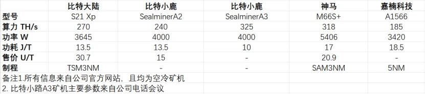 资料来源:比特大陆,比特小鹿,神马矿机,嘉楠科技官网
