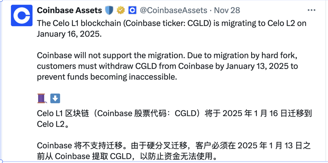 在 L1 公链 Celo 宣布将转型成为 L2 后(通过硬分叉升级),Coinbase 表示将不支持本次升级。这将直接导致成为 L2 后的 CELO 代币从 Coinbase 上下架。