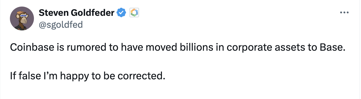 据 Arbitrum 联合创始人 Steven Goldfeder,Coinbase 疑似将数十亿的企业资产转移至 Base 以提高「TVL」。