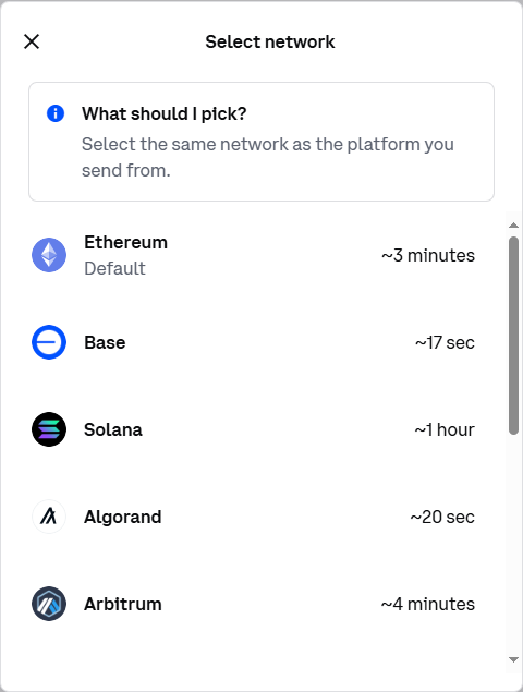 常用 Solana 发送、收取加密货币的用户知道,通常 Solana 网络能在几秒钟内到账。而通过 Solana 网络进行如 USDC 等加密货币的中心化交易所充值、提币也能在几分钟内确认。而使用 Coinbase 提出 USDC 时我们发现,Coinbase 会默认使用需耗时约 3 分钟的以太坊主网 —— 与其对比的是 Coinbase 自己创建的以太坊 Layer 2 Base,只需 17 秒,而 Solana 竟然需要约 1 小时。