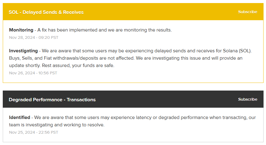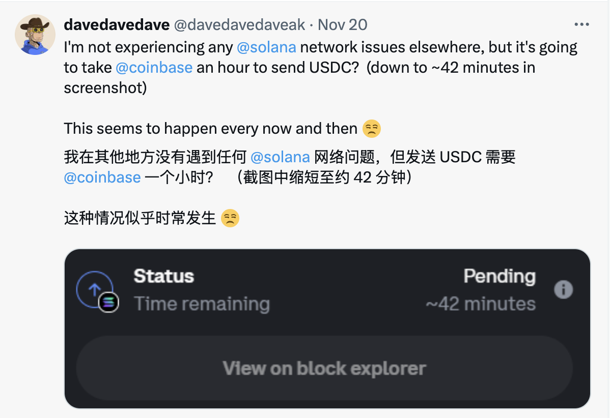 Coinbase 对 Solana 网络的支持极差,时常出现网络延迟、表现下降。