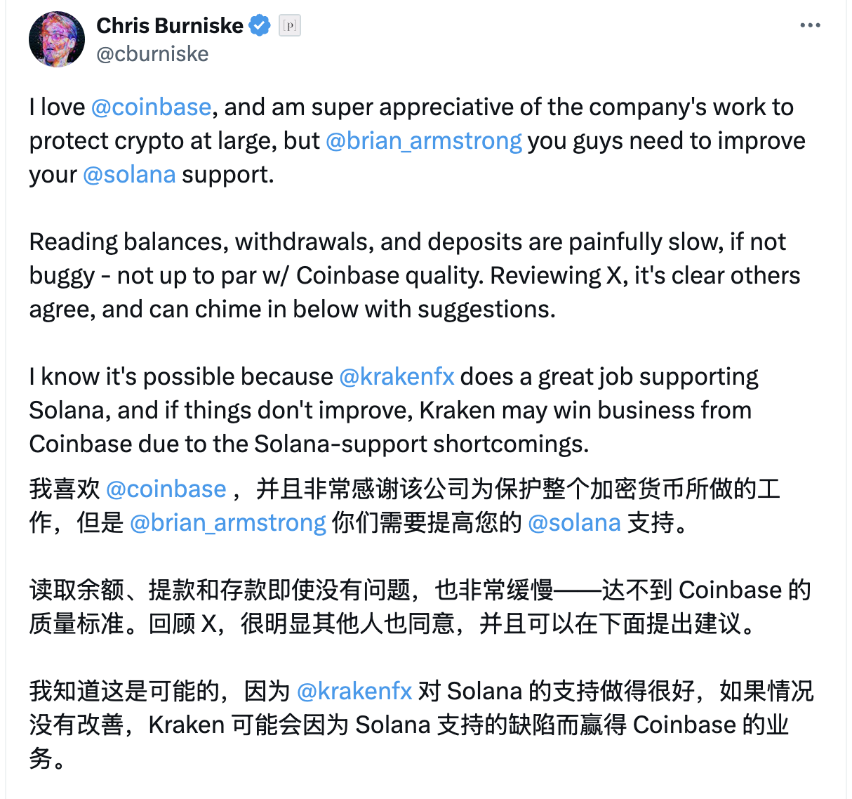 以至于 Placeholder 合伙人、知名 VC Chris Burniske 公开喊话 Coinbase 提高对 Solana 网络的支持力度。