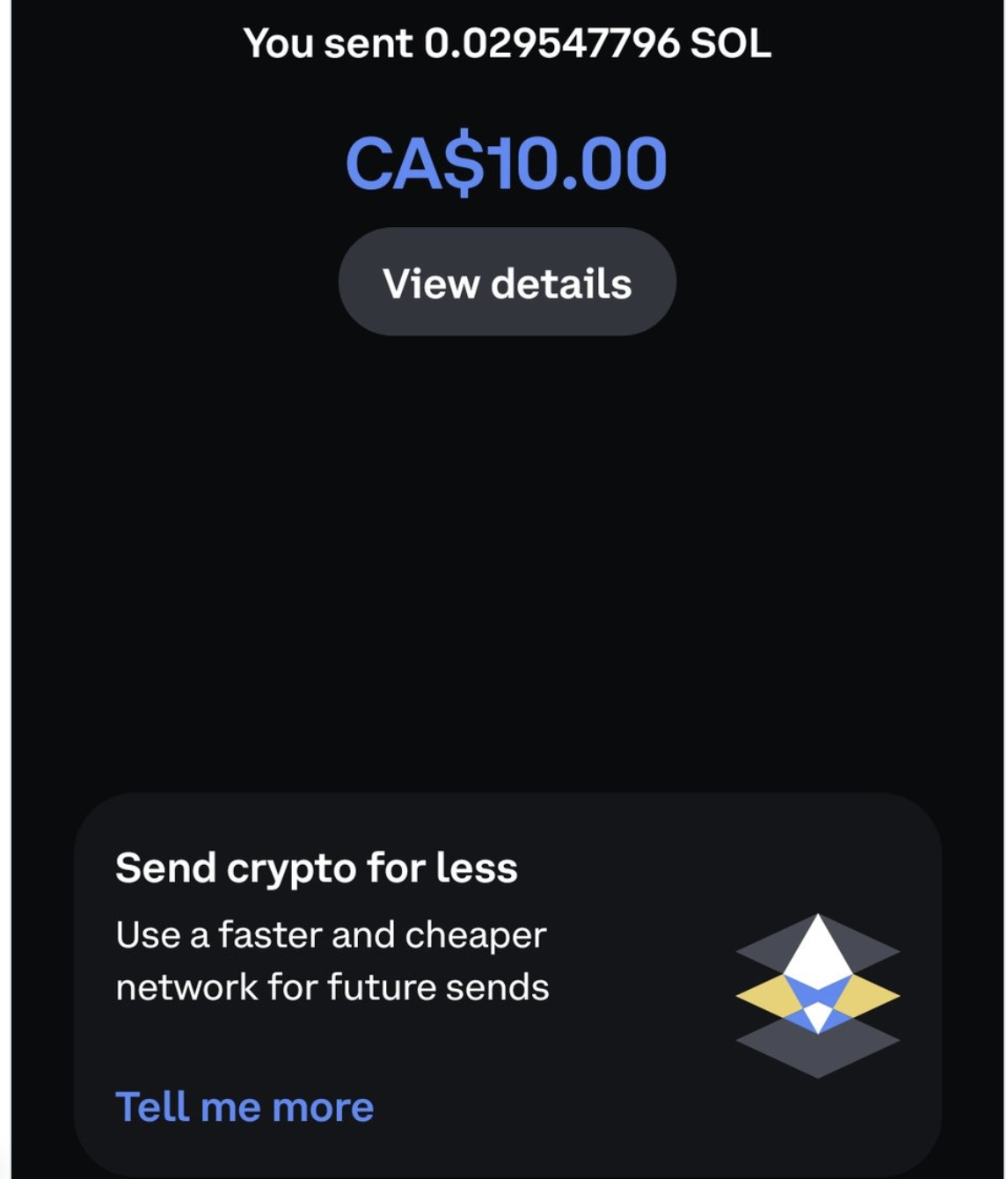 当你在 Coinbase 上使用 Solana 网络发送加密货币后,页面下方将出现「贴心」的提示语:Send crypto for less
