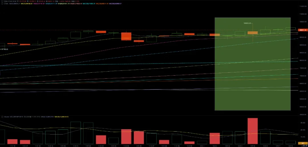 自逼近 10 万美元心理大关以来,BTC 围绕 9 ~ 10 万美元空间展开震荡。伴随均线逐渐粘连,形成心理支撑,本周 BTC 两次突破 10 万美元,最高突进至 104000 美元。