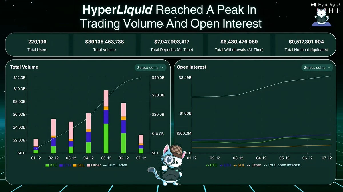 据 Hyperliquid Hub 最新统计 , 7 天内 Hyperliquid 达成了 100 亿美元日交易量;每日未平仓合约高达 35 亿美元;拥有 220, 000+ 用户群,市场表现极为亮眼。