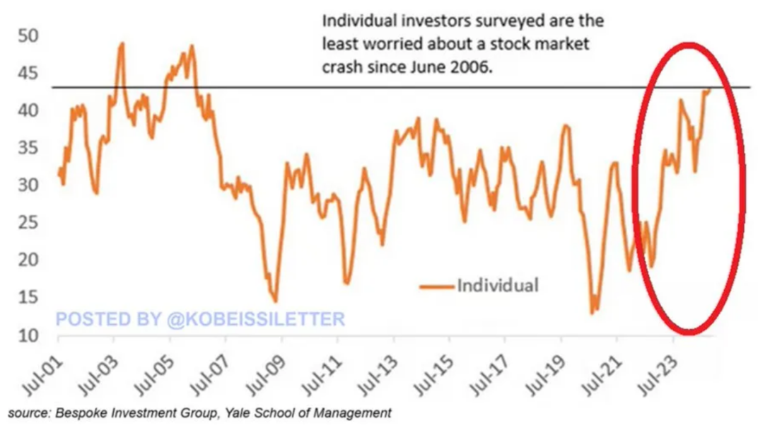 「个人投资者对市场的信心接近历史高位: 46% 的美国个人投资者认为未来六个月内市场崩盘的可能性低于 10% 。这一比例已达到自 2006 年 6 月以来的最高值,并在过去两年间翻了一番。(数据来源:耶鲁管理学院调查)。换言之,投资者对股市的担忧降至 14 年来的最低水平。与此同时,标普 500 指数自 2022 年 10 月触底以来已反弹约 50% 。但另一方面,投资者认为当前市场估值是自 2000 年 4 月互联网泡沫破裂以来最被高估的一次。市场情绪已处于极度亢奋的状态。」