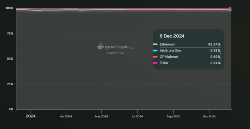 在收入方面,以太坊主网也是以太坊生态内最赚钱的一条链。近一年来,以太坊的收入占比始终保持在 80% 以上,截至 12 月 8 日,该数据为 92%。Base 链在今年开始成为收入第二高的以太坊生态链。