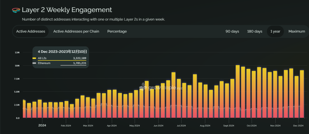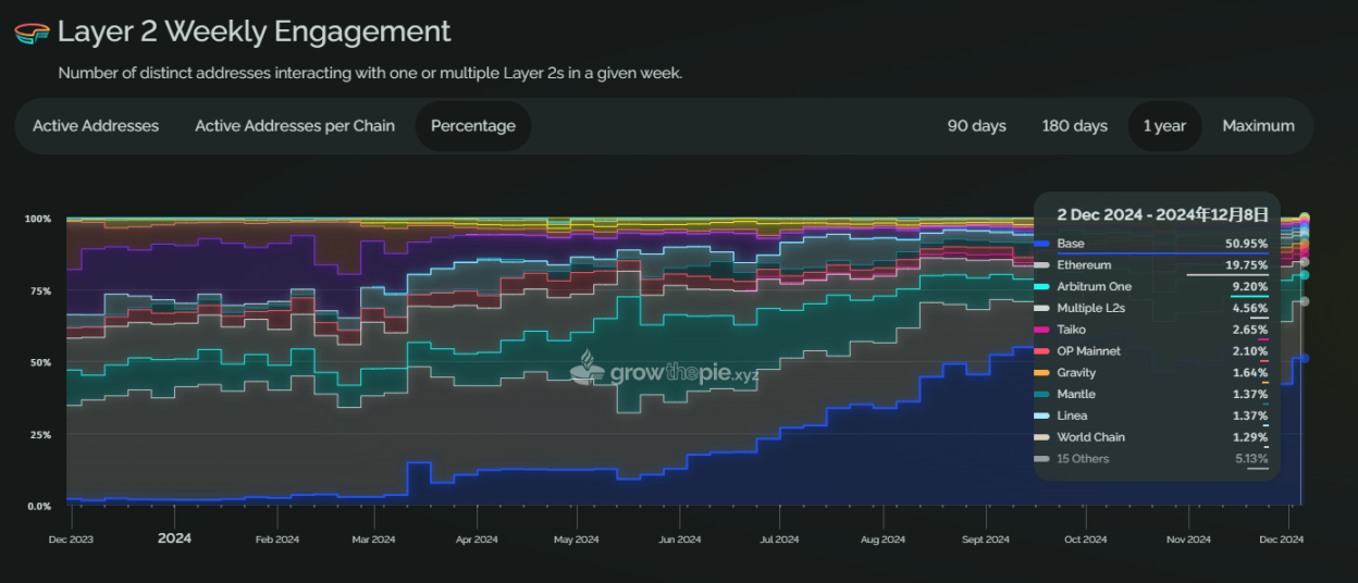 单独看每条链的表现,2023 年 12 月份,以太坊主网是活跃度最高的链,占比约为 32.48%,到 2024 年 12 月,最活跃的链已经变为 Base,占比上升至 50%,以太坊主网为第二名 19%,Arbitrum 第三,占比 9.2%。
