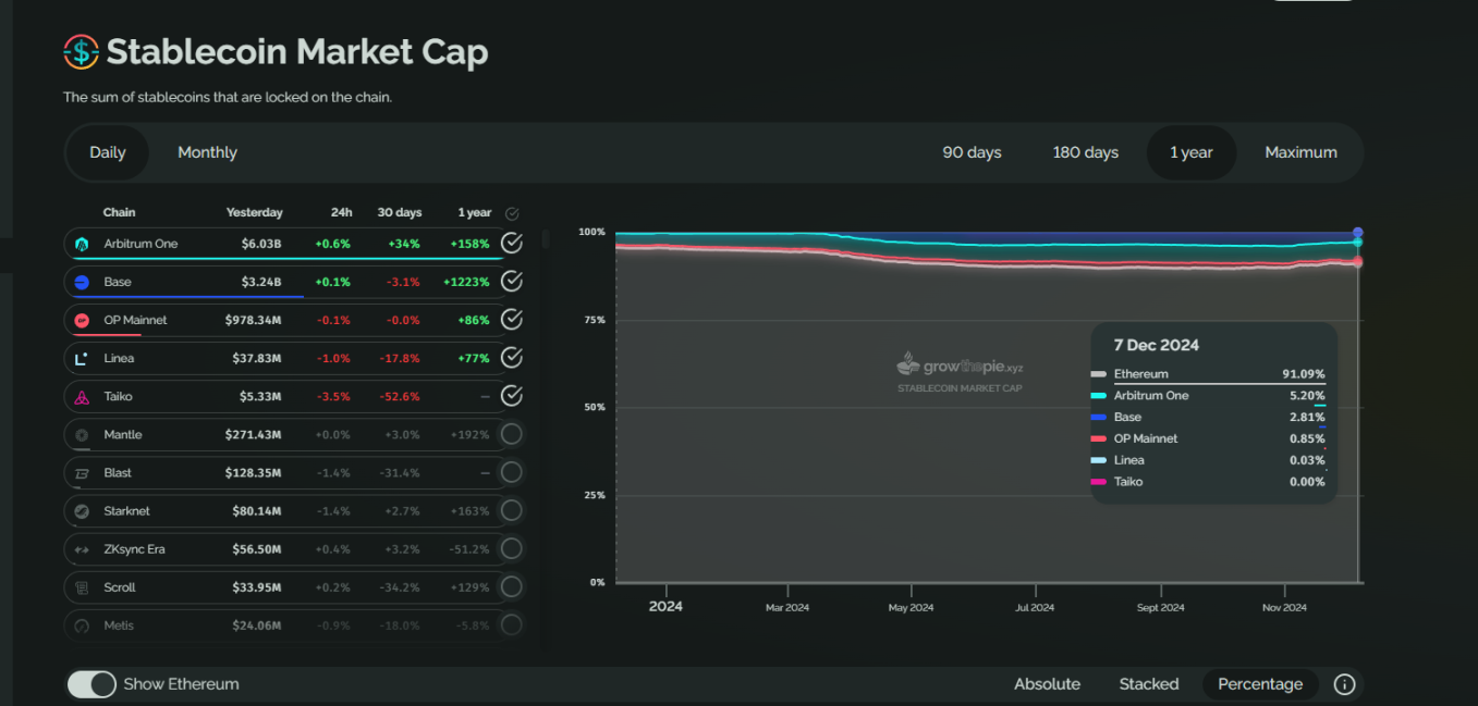 但在 TVL 方面,以太坊主网似乎仍是大户的第一选择。从链上锁定的稳定币总金额来看,以太坊主网在去年 12 月份的占比约为 95% 左右,目前占比略有下滑,但仍占到 91% 左右。而且 TVL 数据也几乎是以太坊主网在近一年来唯一明显上涨的数据。2023 年 12 月份,以太坊主网的 TVL 量约为 288 亿美元,截至 2024 年 12 月份,该数据上涨到 775 亿美元左右。增长幅度约为 2.69 倍,这一数据的增长率也超过了以太坊价格的增长率,这也与牛市下资产价格上涨有关。在 Layer2 当中,Arbitrum 和 Base 的稳定币 TVL 排名第二和第三。