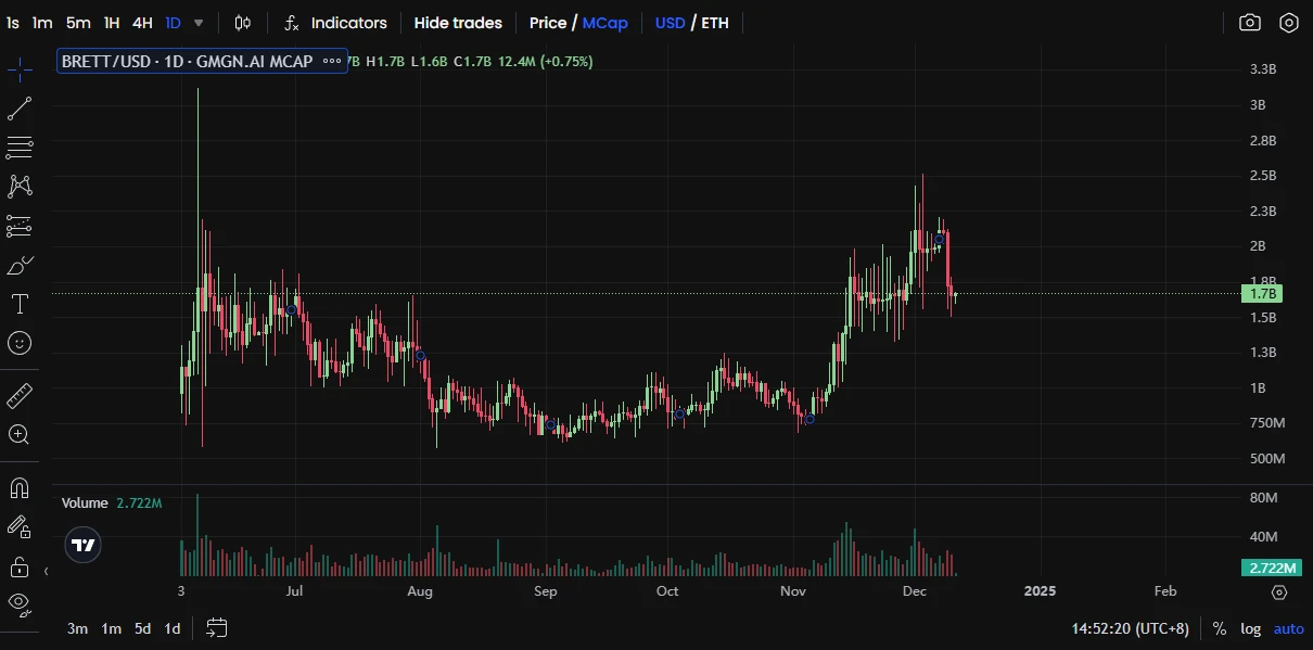 据 GMGN 数据 ,BRETT 市值从最高一度突破 25 亿美元后下跌,目前市值为 17 亿美元。