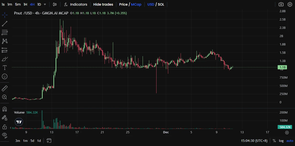 据 GMGN 数据 ,PNUT 市值从最高一度突破 20 亿美元后下跌,最低跌破 10 亿美元,目前市值为 11 亿美元。