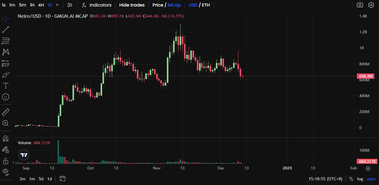据 GMGN 数据 ,Neiro 市值从最高一度突破 12 亿美元后下跌,目前市值为 6.5 亿美元。