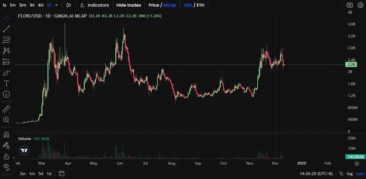 据 GMGN 数据 ,FLOKI 市值从最高一度突破 33 亿美元后,目前市值为 22 亿美元。