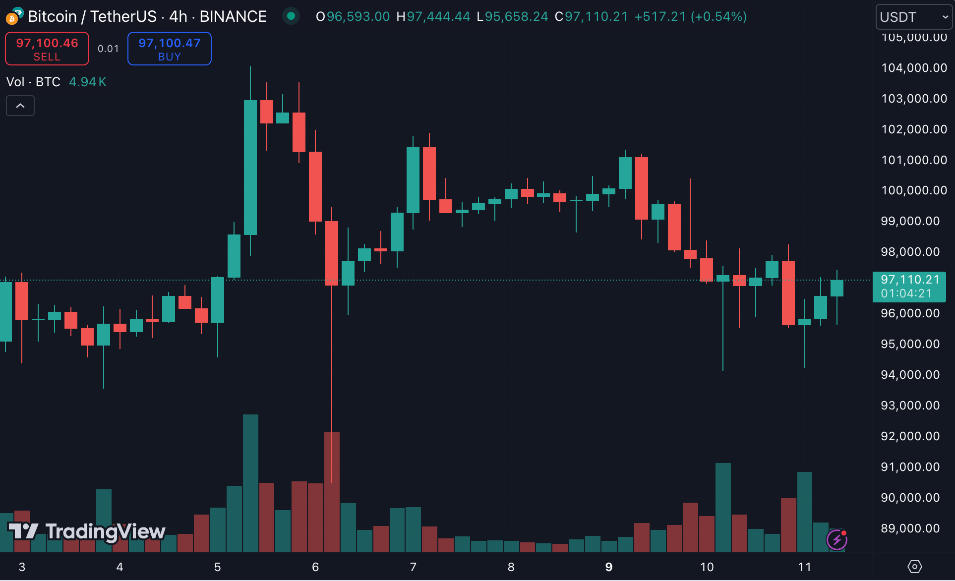 撰稿当下, 比特币 仍持续在 9.8 万美元下方盘整,暂报 97,110 美元,近 24 小时上涨 0.54%。
