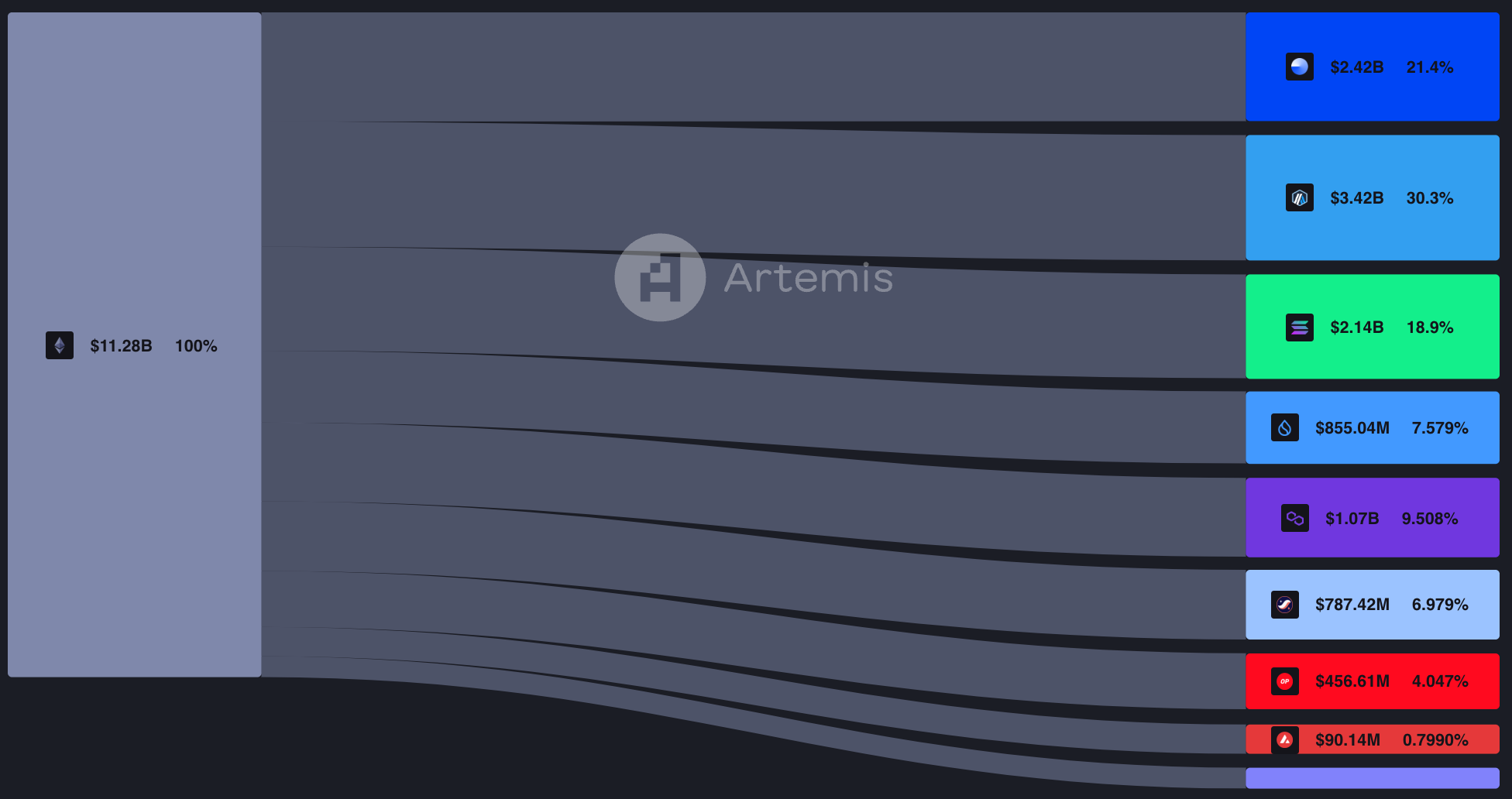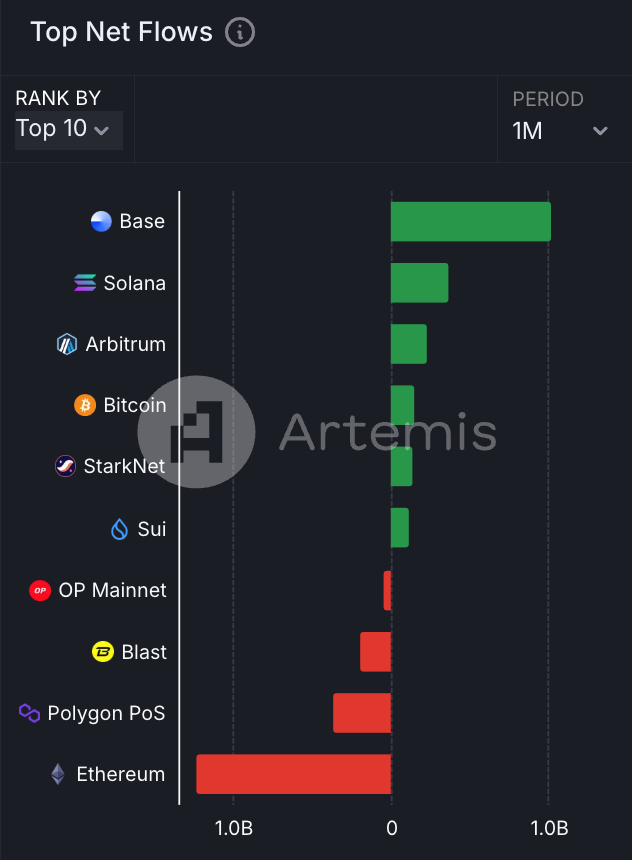 此外,Artemis 数据指出 ,过去一个月以太坊的资金净流出量是主流公链中最大的,净流出高达 12 亿美元。相对地,Base、Solana 和 Arbitrum 是净流入量最高的三个公链,规模分别为 10 亿美元、3.68 亿美元和 2.27 亿美元。