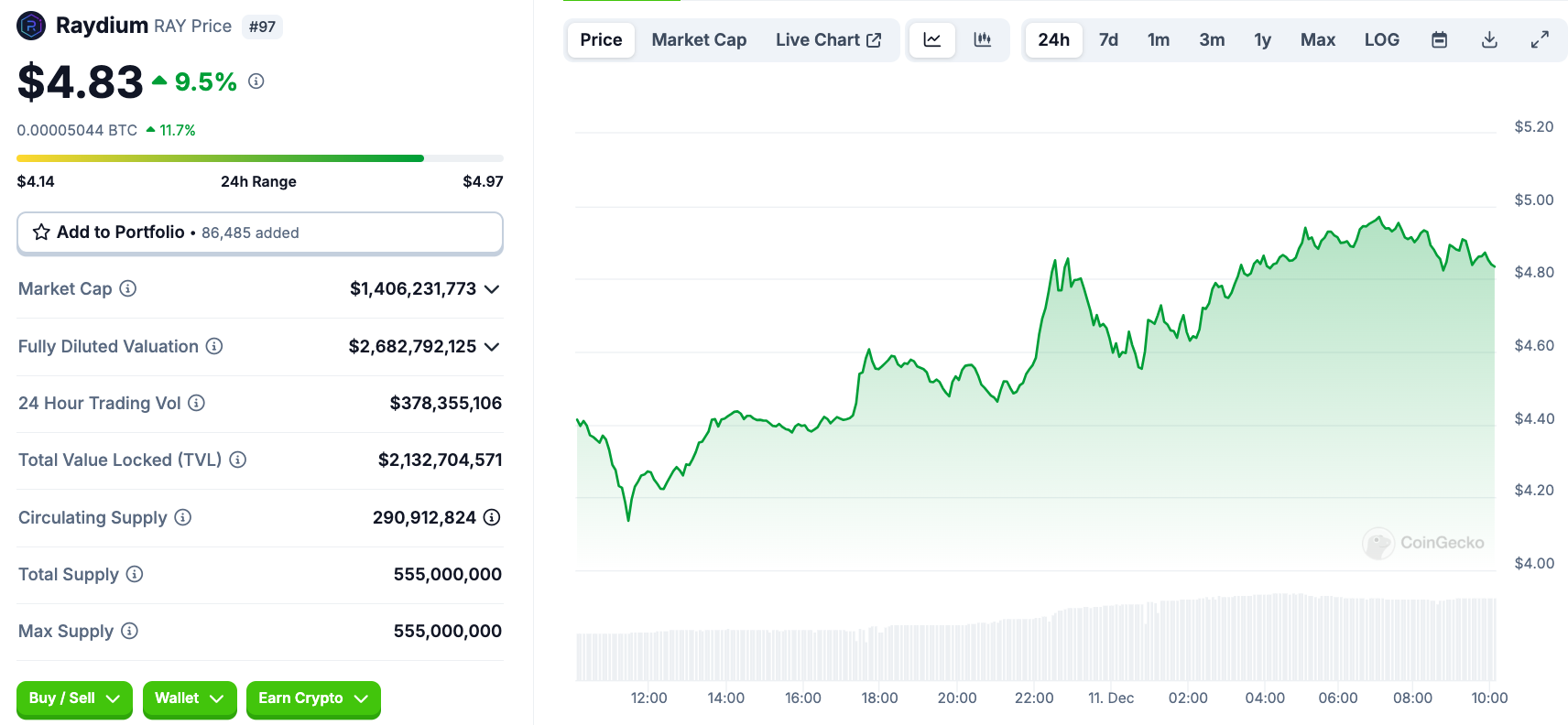 受此激励,RAY 价格迎来上涨。CoinGecko 数据显示,RAY 近 24 小时一度冲高至 4.97 美元,上涨 10%,近 1 年更涨超 500%。