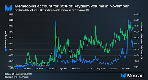 Messari 表示,Raydium 的亮眼表现得益于迷因币的火热,迷因币占 Raydium 11 月交易量的 65%,创下历史新高。