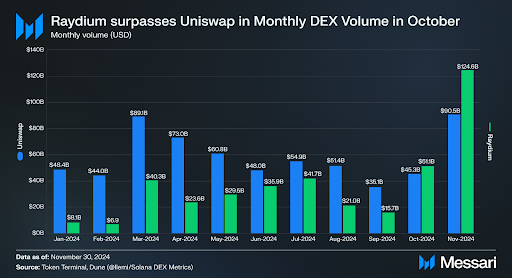 据 Messari 报告 ,Raydium 在 10 月份成为所有链上交易量领先的 DEX,这一趋势在 11 月加速,Raydium 月交易量达到 1,246 亿美元,比 Uniswap 的 905 亿美元高出 30%。
