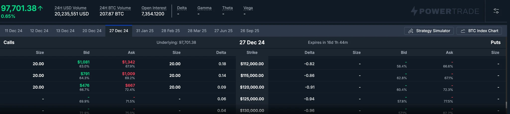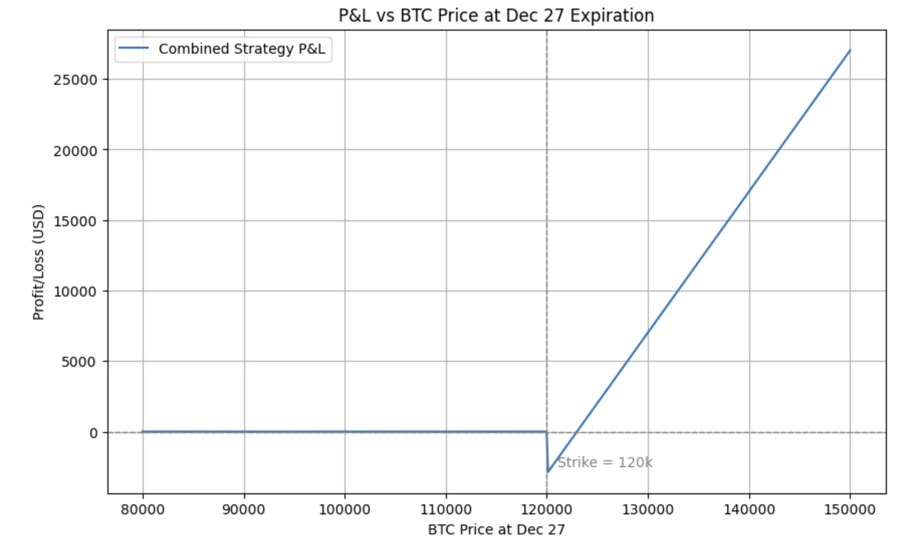2. 买入行权价 12 万美元的比特币看涨期权(12 月 27 日到期):这个期权的定价更接近 8% 的概率评估,可以在比特币在 12 月 27 日前突破 12 万美元时提供对冲保护。如果比特币大幅上涨,期权收益可以抵消 Polymarket 的损失。