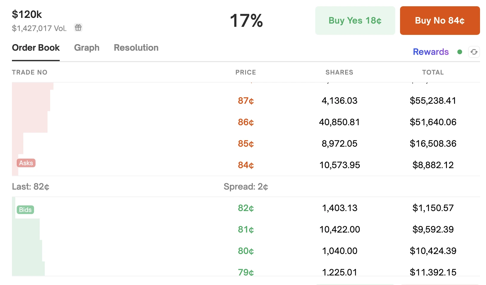Polymarket 预测市场显示 BTC 在 12 月 31 日前达到 12 万美元的概率为 17% ——是期权隐含概率 8% 的两倍多。