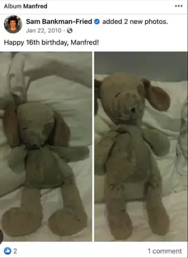 自从两岁起,SBF 就一直有着一个名叫 Manfred 的小熊填充玩具。这个不起眼的小熊见证了他从斯坦福到波士顿的大学时光,到纽约的交易员职场生涯,从伯克利和香港到巴哈马创建了 Alameda 和 FTX,这些都是 SBF 一生中最重要的时刻。