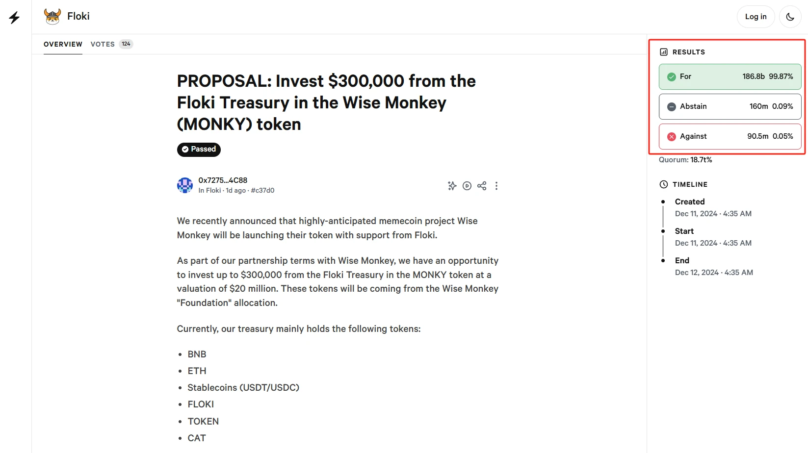 提案通过 Floki 国库投资 30 万美元购买 MONKY 代币