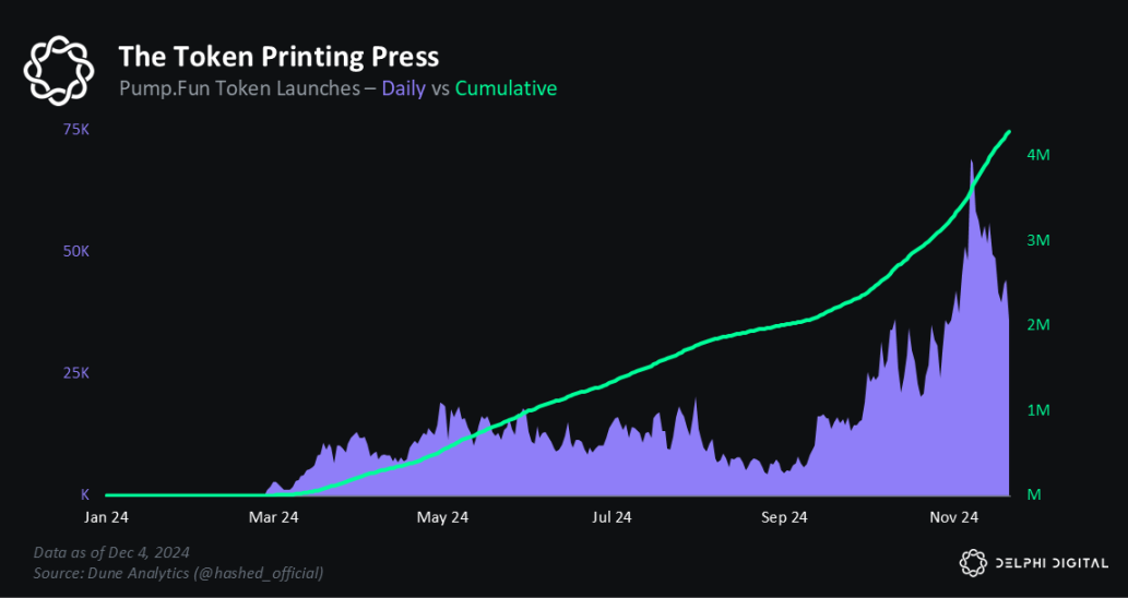 pump.fun 等应用程序使代币创建变得简单:自 2024 年 1 月以来,已发行超过 400 万个代币,其中 Solana 的 Raydium 发行了超过 5 万个代币。