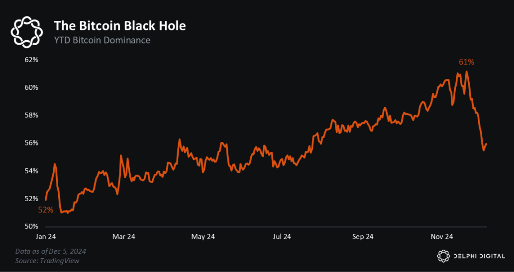 这种反差的原因是什么?首先是比特币的主导地位:BTC 价格今年迄今上涨了 130% ,达到了三年来的最高主导地位。
