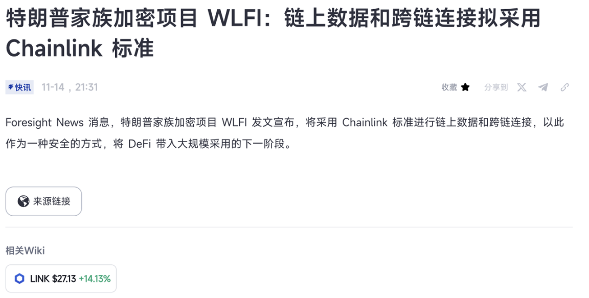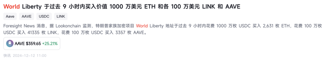 据链上数据, World Liberty 项目钱包买入 ETH、LINK、AAVE 代币,这也是 AAVE、LINK 在 12 月 12 日大涨的主要消息面推动力。