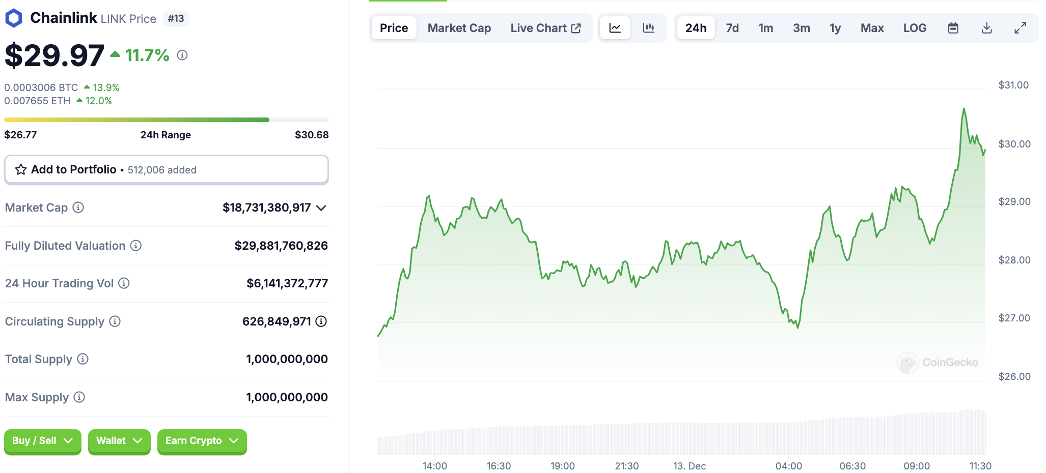 截稿前币价暂报 29.97 美元,近 24 小时上涨 11.7%。