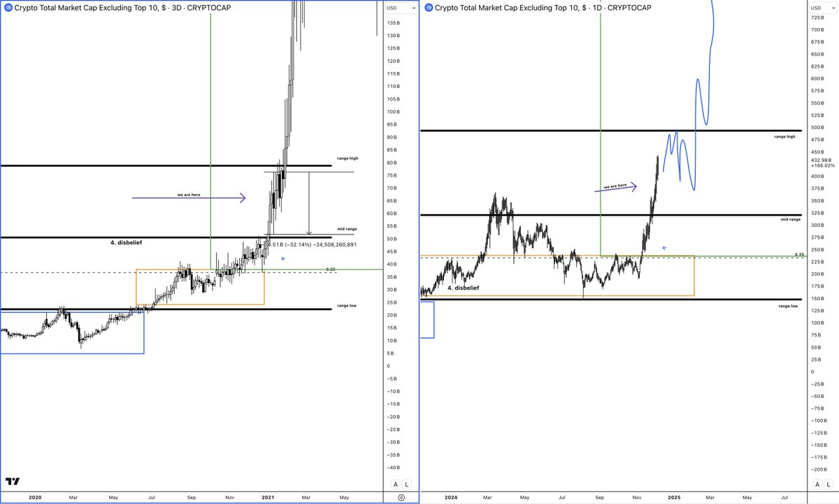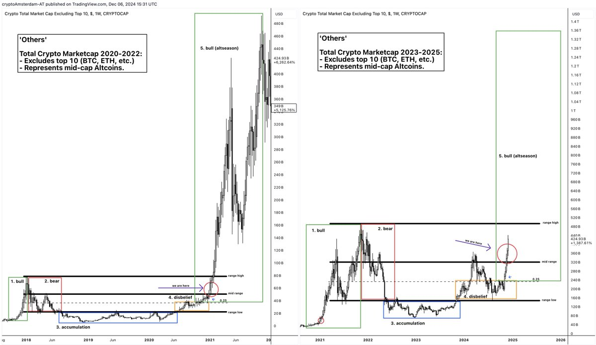 即使回顾上一轮牛市周期,在山寨季刚𫔭始时,「Others」市值图表在突破区间高位之前,也曾出现过 30% 的大幅回拨。