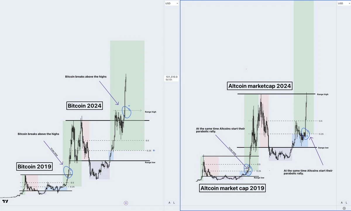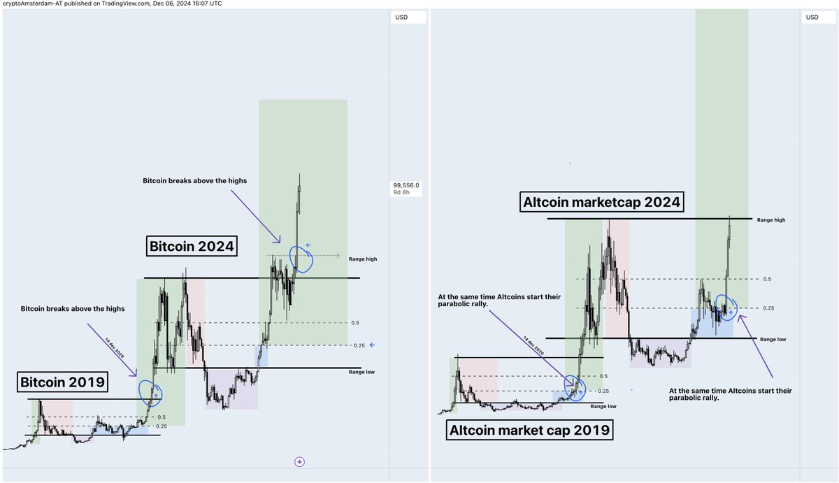- 阶段 2:比特币突破历史新高,山寨币𫔭始进入快速上涨阶段。